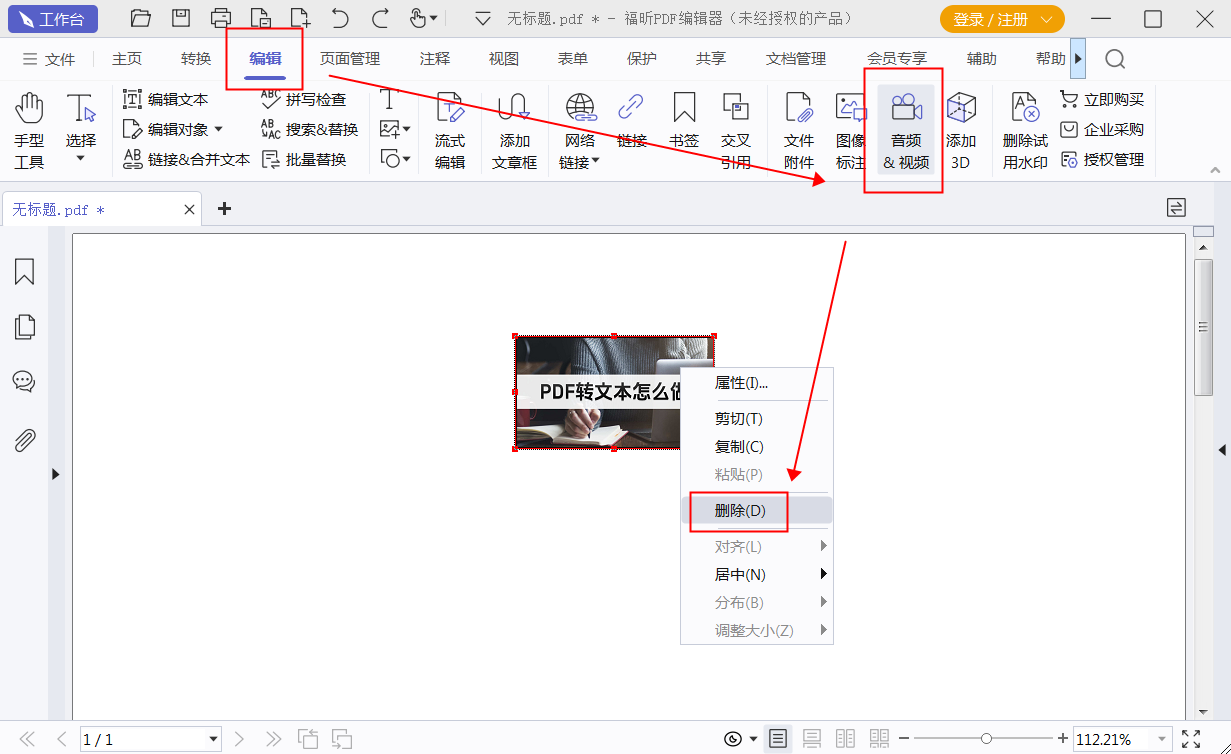 各位小伙伴在PDF文档导入后,点击页面顶部【编辑】栏,找到【音频&视频】并单击,就可以选择要删除的音频并右键删除啦。