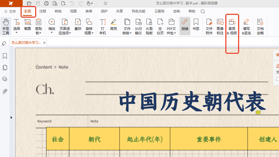步骤二:找到插入视频功能。在打开的PDF文档页面顶部,找到“主页”菜单栏,点击它,在弹出的下拉菜单里找到“音频&视频”选项,再单击这个选项。