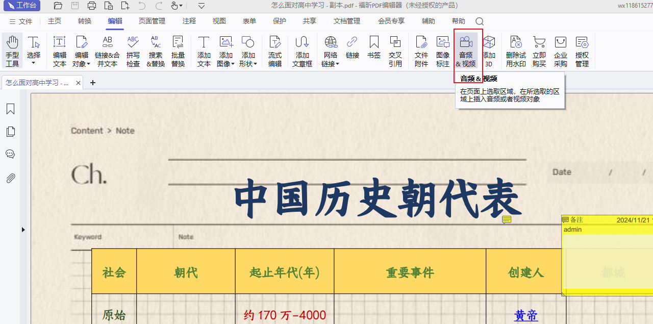 步骤二:打开文件后,点顶部菜单的【编辑】,选【音频&视频】,然后选好视频要放的位置,还能选个图片当视频封面。