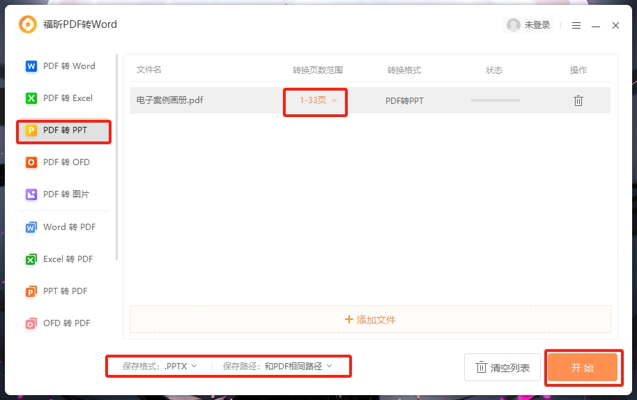 最后,我们上传需要转换格式的PDF文档之后,设置好保存的路径,就可以点击【开始】,等到软件将PDF文档批量转换成PPT了。