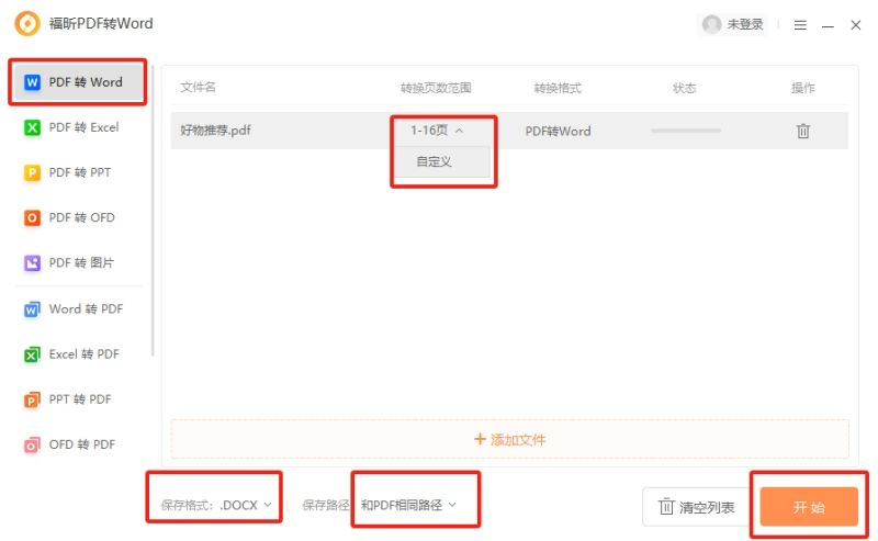 然后在插件中,大家可以导入需要被转换格式的文档,最多可以同时添加50个文档,之后设置好转换页数范围以及保存的路径后,就可以点击【开始】,等待文档转换成功了。