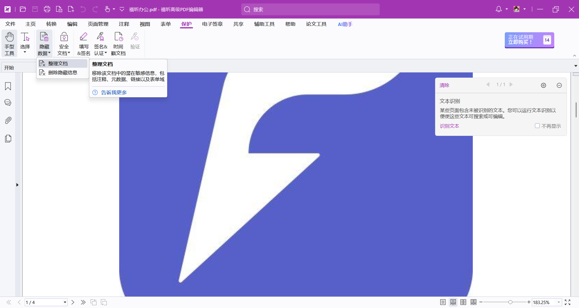 打开PDF文档之后,点击【保护】-【隐藏数据】-【整理文档】,即可一次性删除PDF文件中的所有隐藏信息。