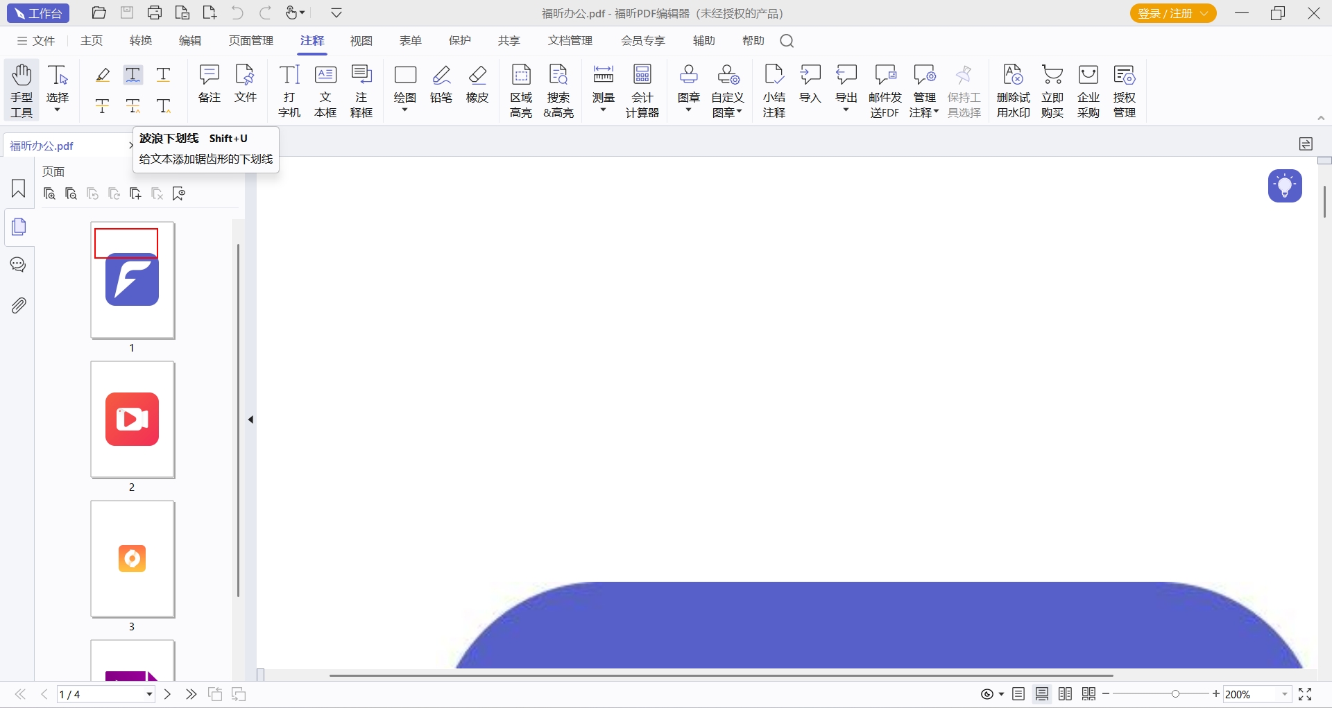 点击页面上方的注释,再找到波浪线图标,然后点击图标。