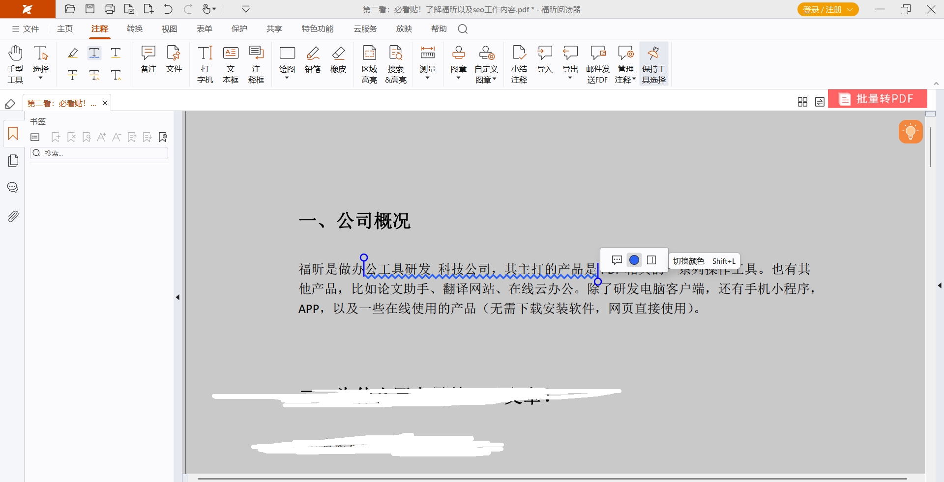 按住鼠标左键选择需要添加波浪线的文本内容,再松开鼠标,下划线就添加好了。另外,点击页面上方的注释格式,还可以设置波浪线的颜色、不透明度等等。