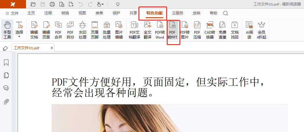 在菜单栏找到【特色功能】,然后在下方找到【PDF转PPT】